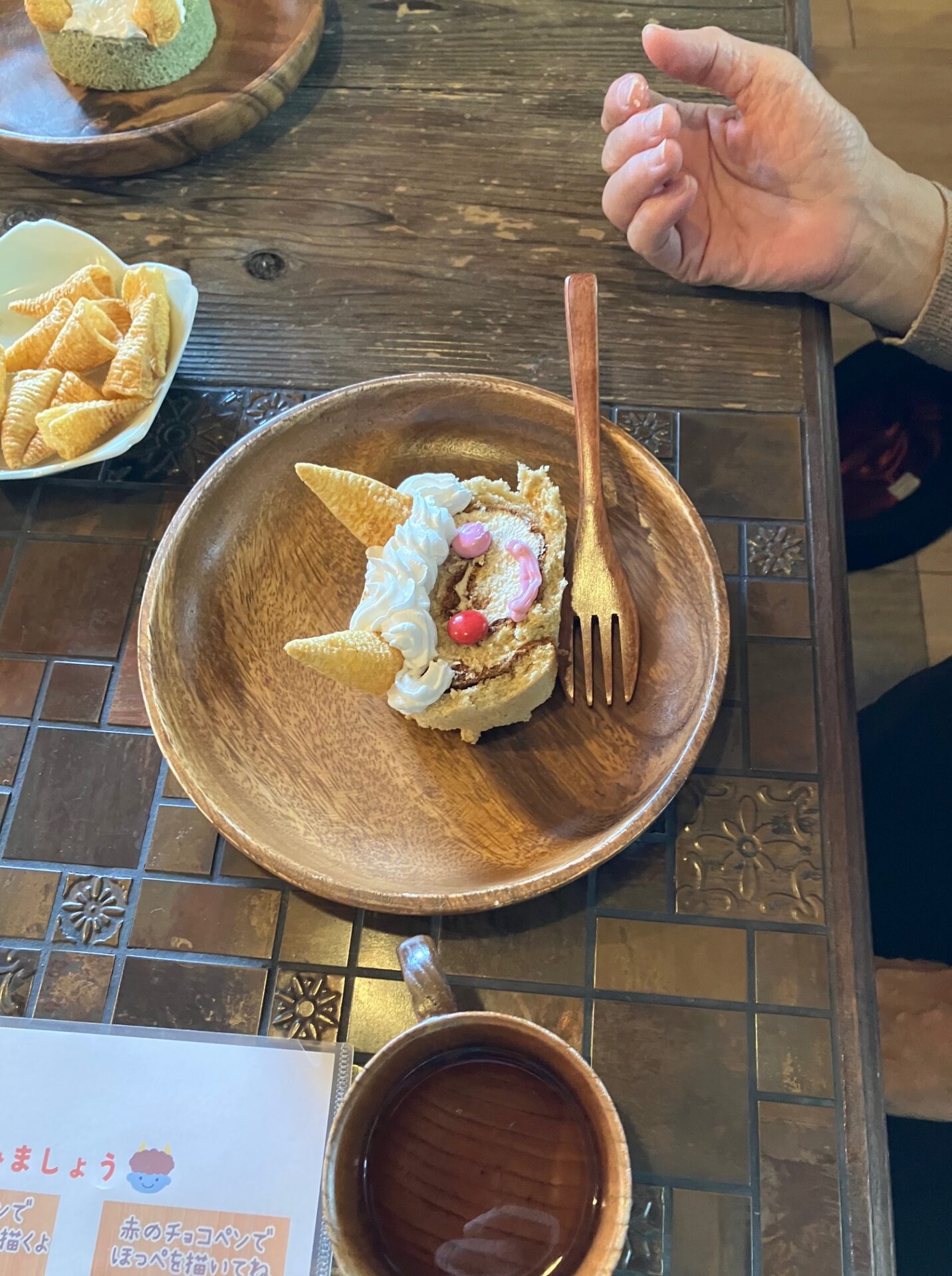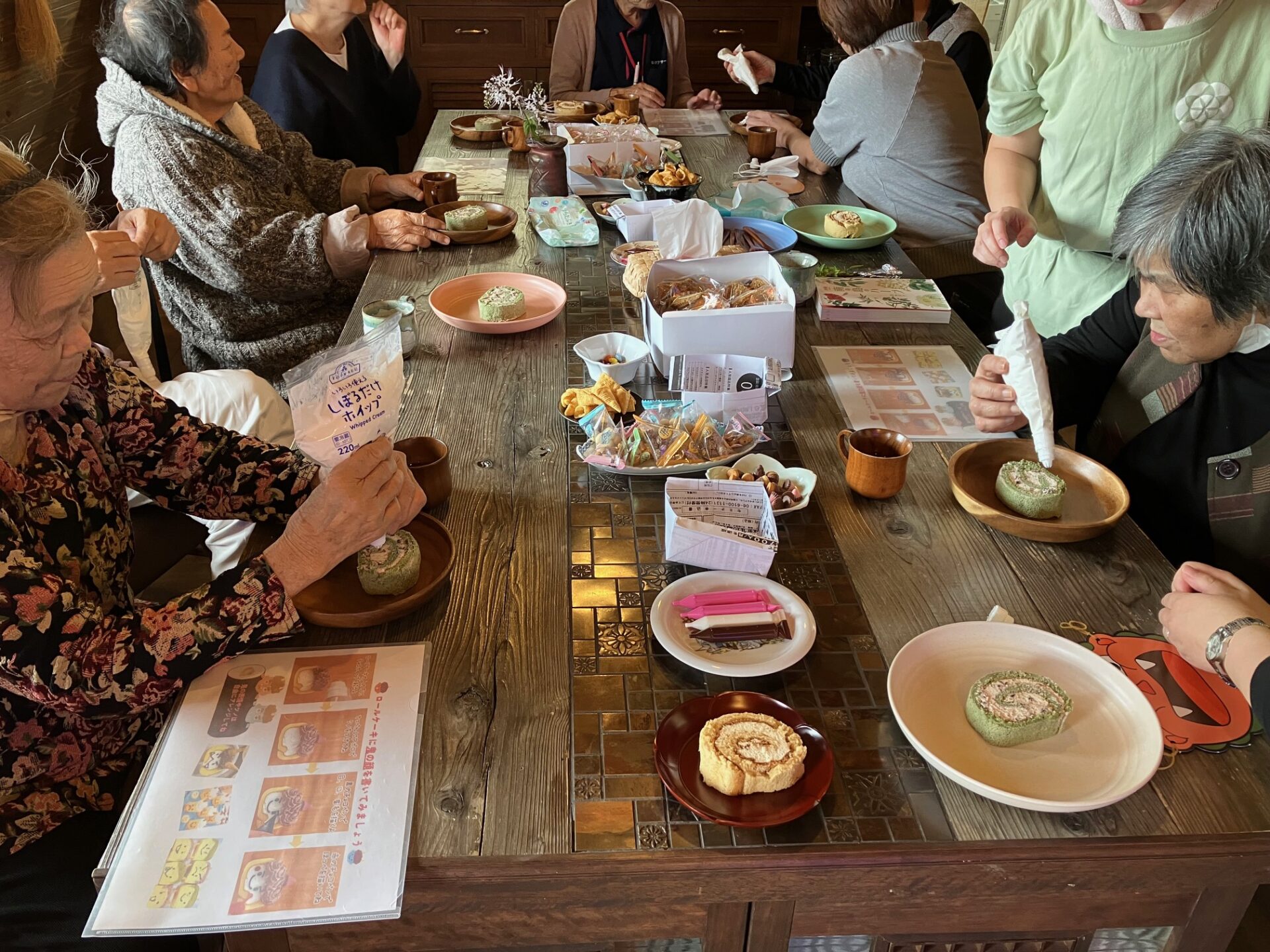 ロールケーキにホイップクリームやチョコペンを使って鬼の顔を描き、それぞれ出来上がったケーキをハーブティーと一緒に楽しみました。